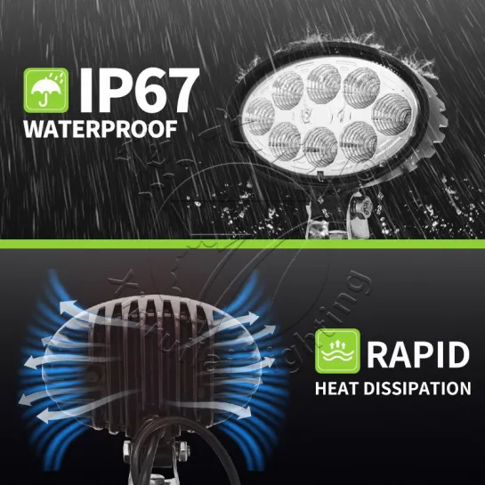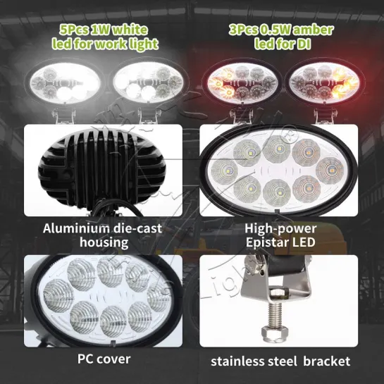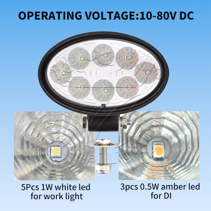 This LED work light operates on a wide voltage range of 10-80V DC, making it suitable for various vehicles and machinery. It is equipped with 5pcs 1W white LEDs for bright work illumination and 3pcs 0.5W amber LEDs for daytime indicator (DI) function. The dual-color design enhances visibility and safety in different working conditions, making it ideal for forklifts, trucks, construction equipment, and agricultural vehicles.