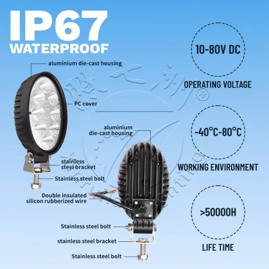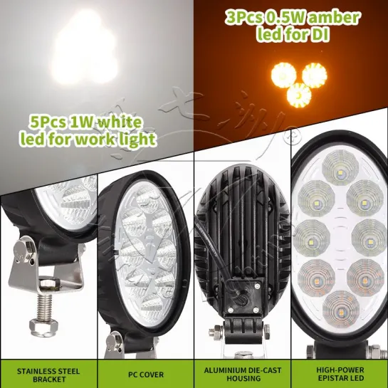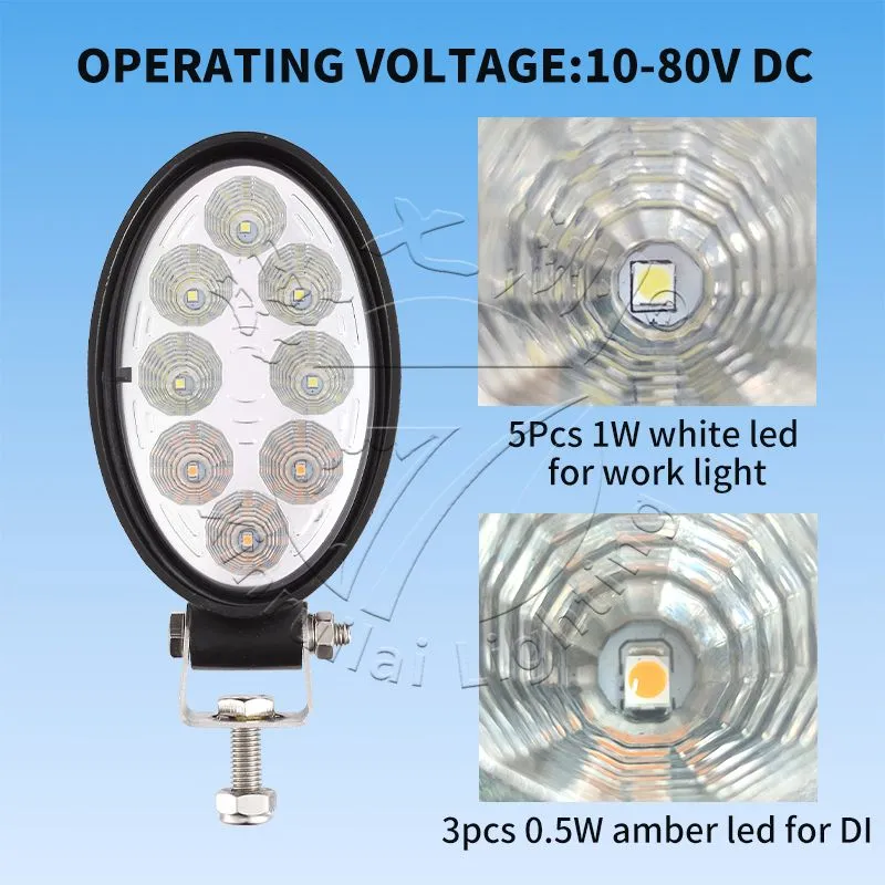This LED work light features 5pcs 1W white LEDs for powerful illumination and 3pcs 0.5W amber LEDs for DRL or warning function. Designed with a wide 10–80V DC operating voltage, it fits forklifts, trucks, off-road vehicles, and construction equipment. The die-cast aluminum housing ensures excellent heat dissipation and durability, while the stainless steel bracket and PC lens cover provide strong protection against water, dust, and vibration—ideal for harsh working environments.